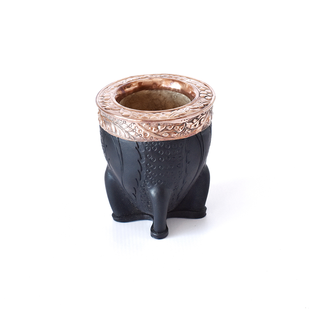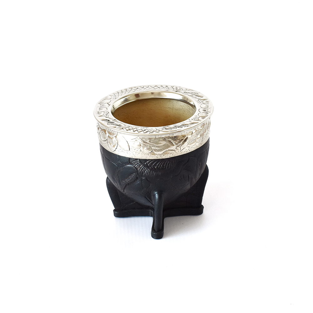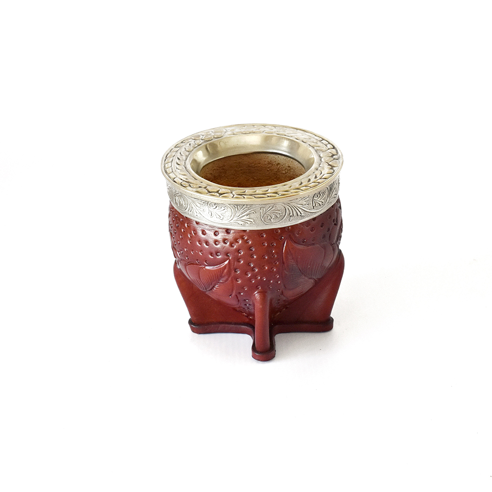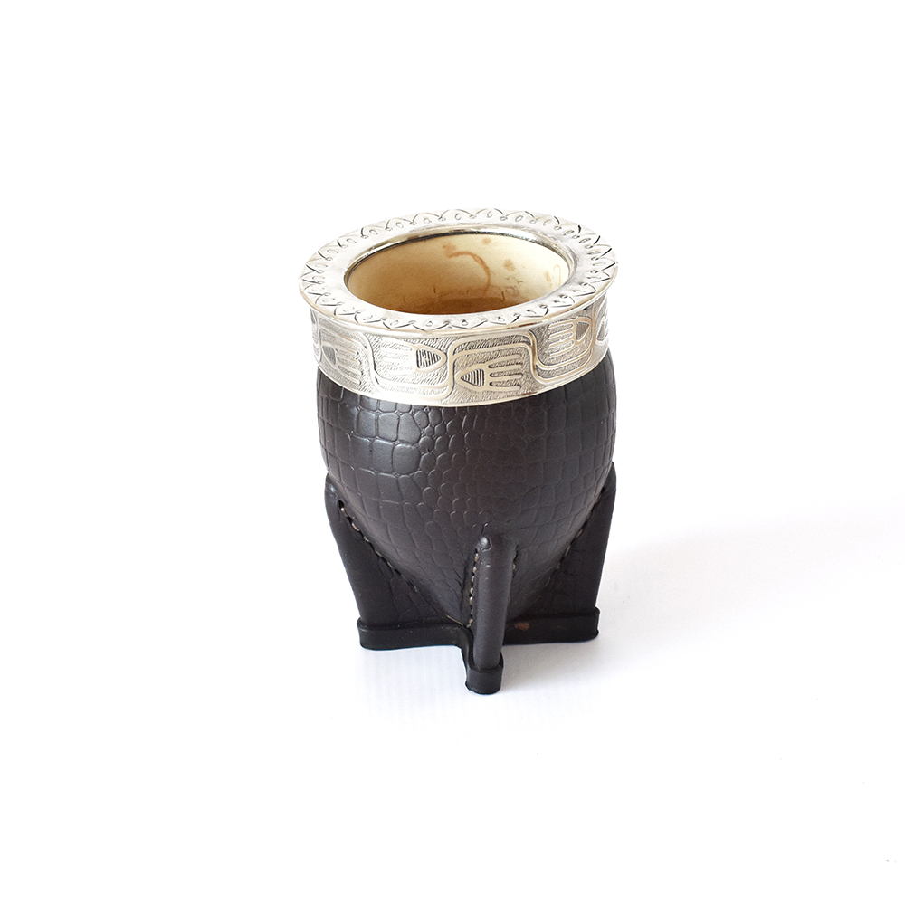 Mate imperial con interior de calabaza, forrado en cuero 100% vacuno, con virola y guarda cinceladas de alpaca, bronce o cobre Y 4 LETRAS A ELECCION
